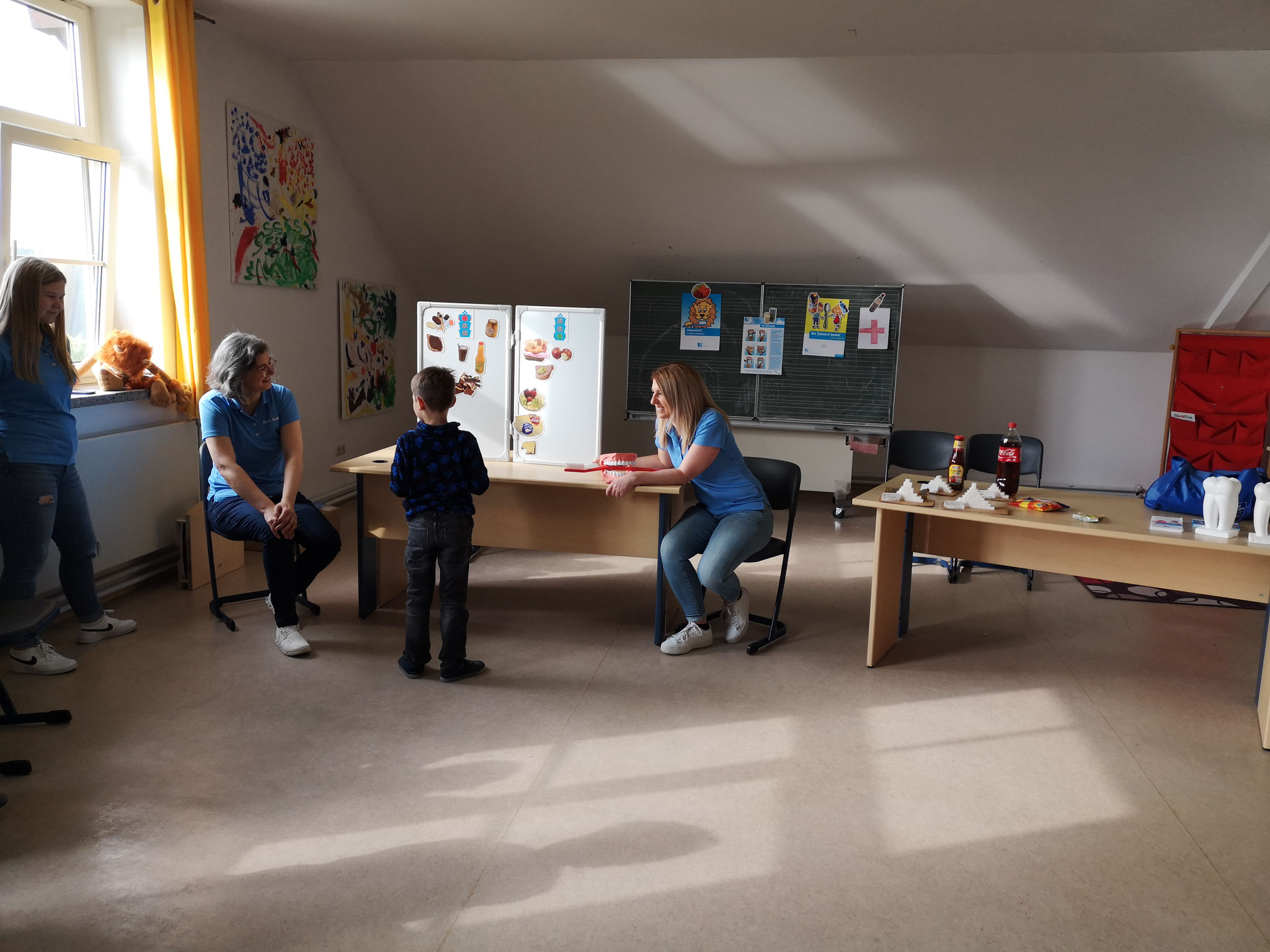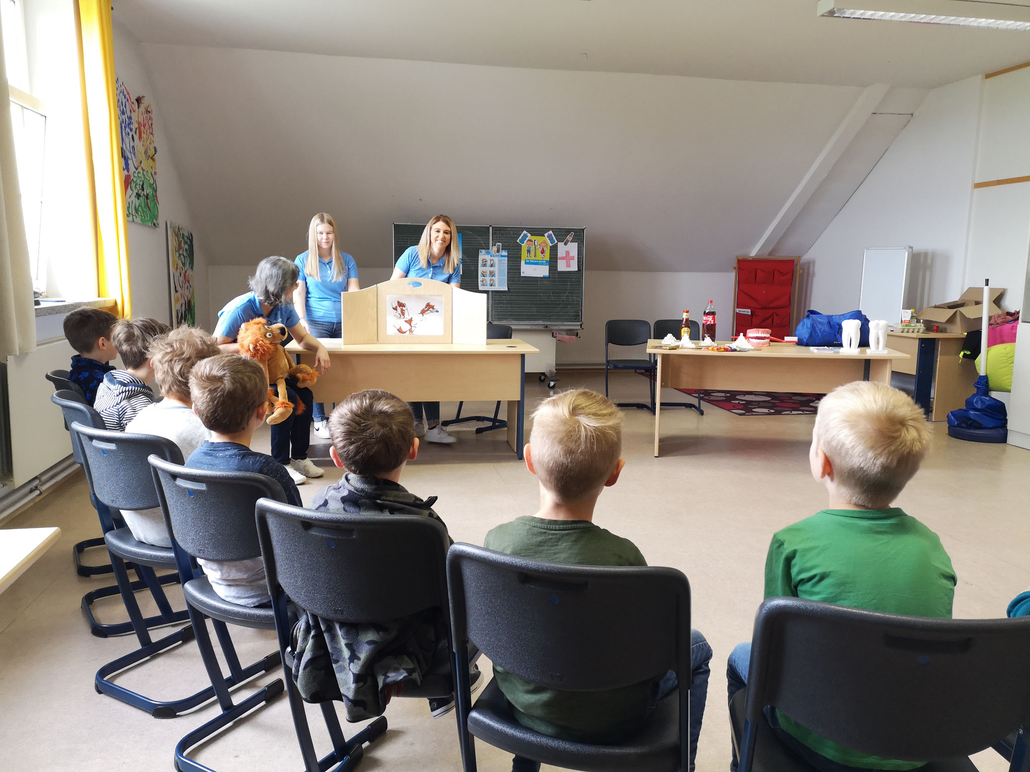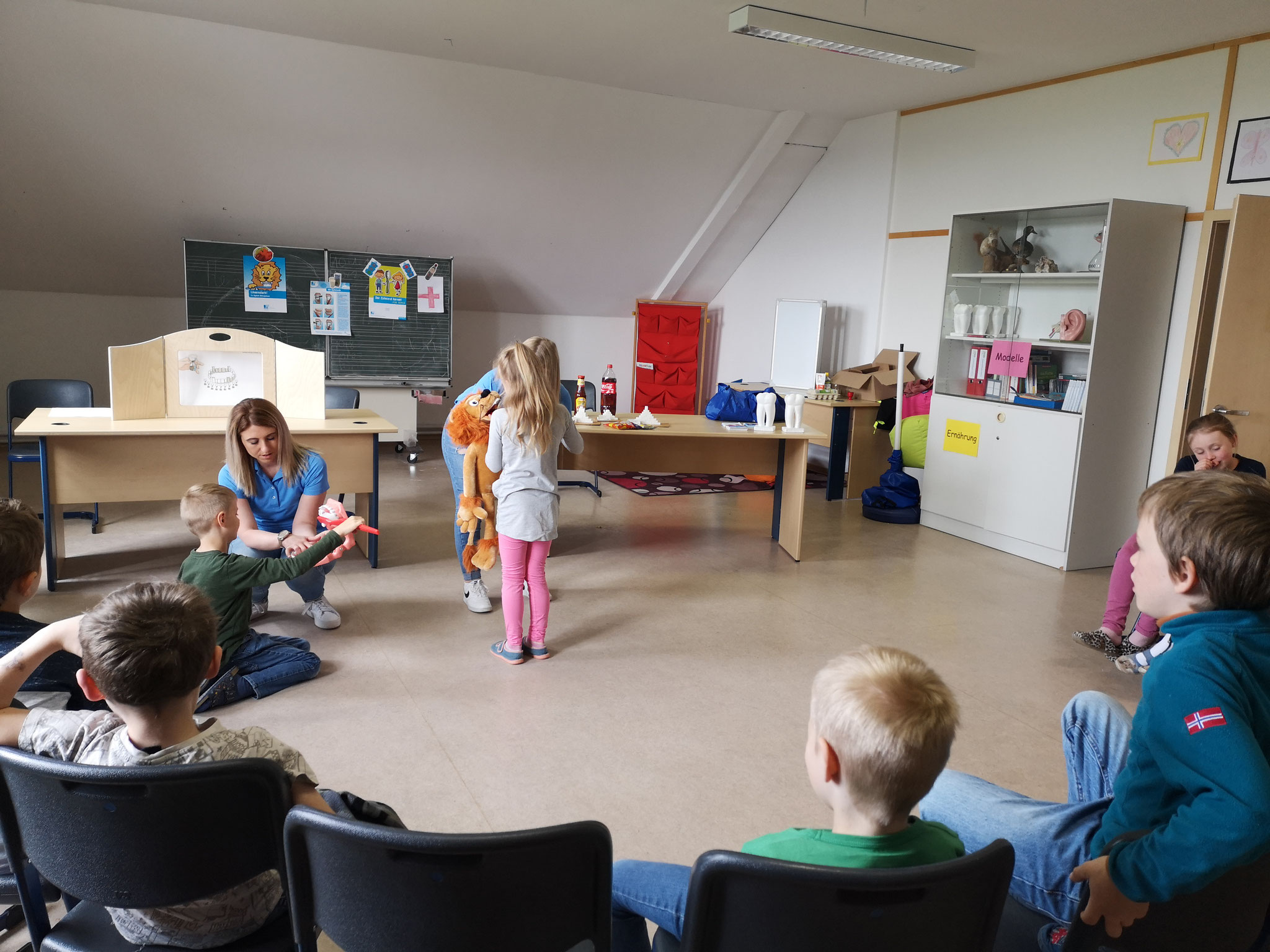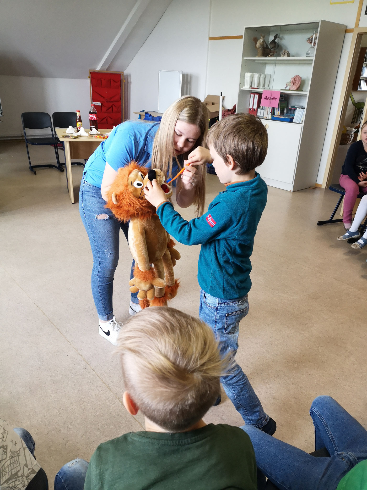 Die Kinder hörten eine Geschichte zum Thema "Zahnhygiene", erzählt vom Löwen Dentulus mit Hilfe eines Kamishibai-Theaters. Anschließend wurden die Themen Zahngesundheit, Zähneputzen und gesundes Essen thematisiert. Bei einem Versuch konnten die Kinder beobachten, wie wichtig der Schutz der Zahnpasta für die Zähne ist.
