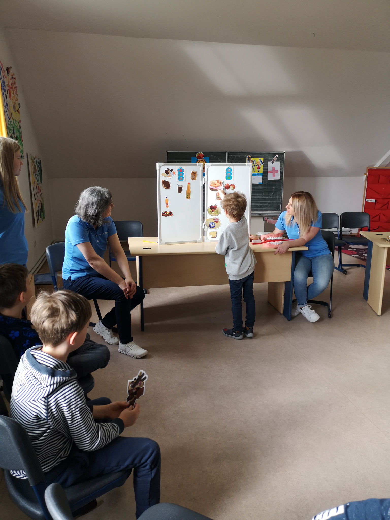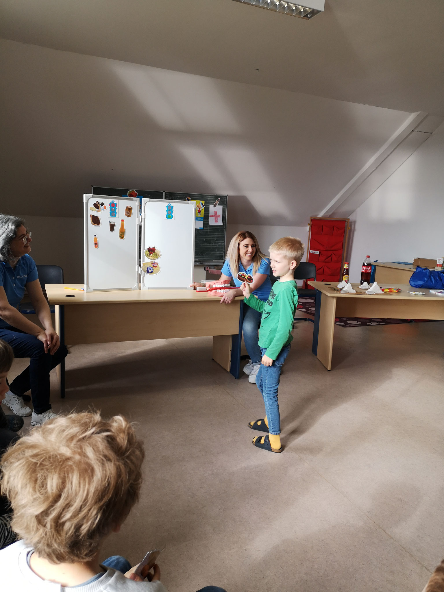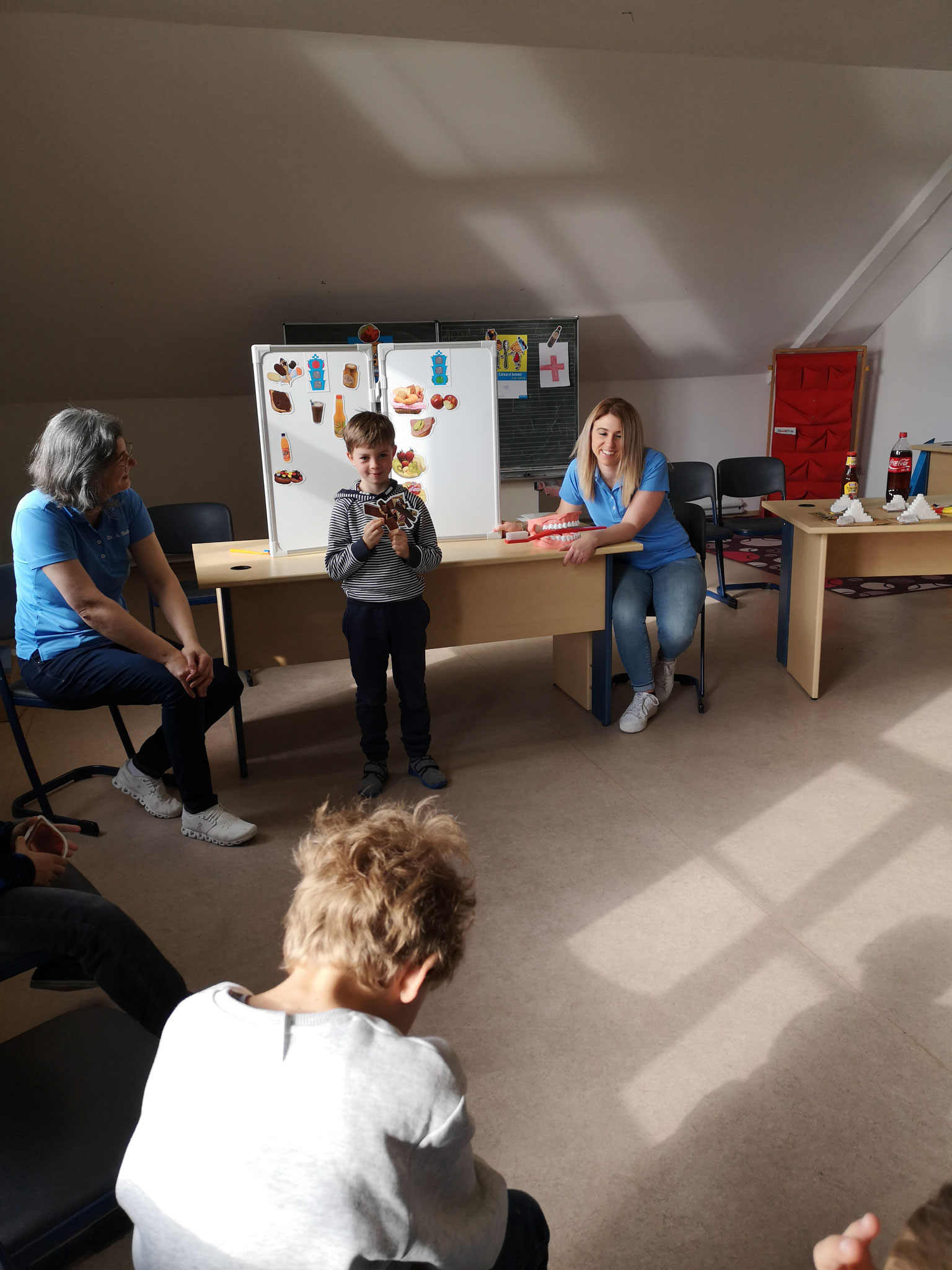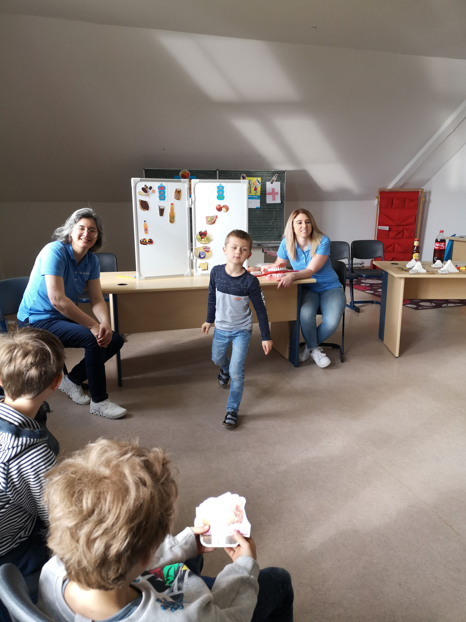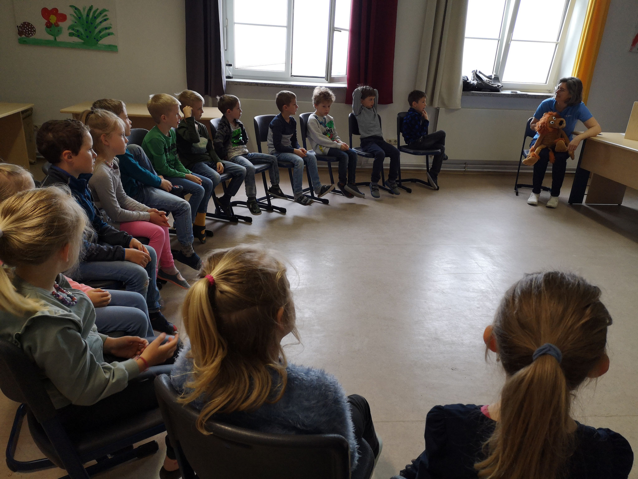 Die Kinder hörten eine Geschichte zum Thema "Zahnhygiene", erzählt vom Löwen Dentulus mit Hilfe eines Kamishibai-Theaters. Anschließend wurden die Themen Zahngesundheit, Zähneputzen und gesundes Essen thematisiert. Bei einem Versuch konnten die Kinder beobachten, wie wichtig der Schutz der Zahnpasta für die Zähne ist.